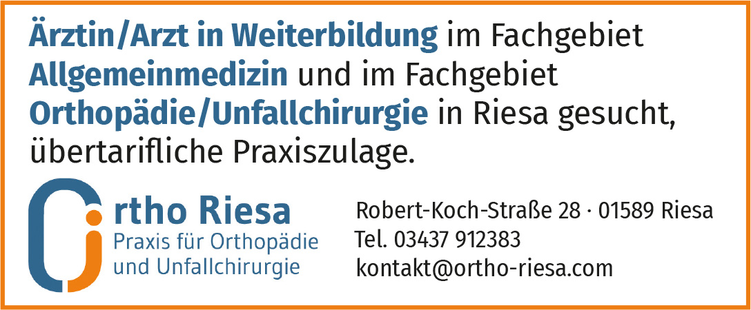 Ärztin/Arzt in Weiterbildung im Fachgebiet Allgemeinmedizin und FÄ/FA für orthopädisch/unfallchirurgische Praxis in Riesa gesucht. Robert-Koch-Straße 28 · 01589 Riesa – Tel. 03525 633373 – kontakt@ortho-riesa.com